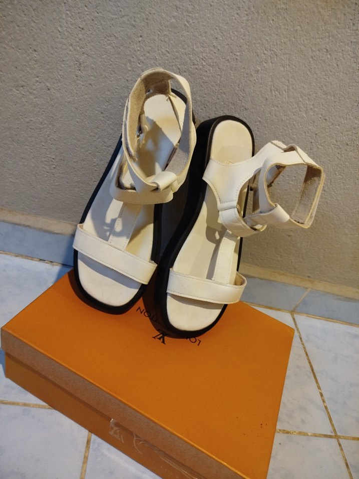 Beyaz tokalı bantlı, dolgu topuklu ve kauçuk tabanlı sandalet. Minimalist tarzıyla günlük ve sokak modasına uygun.