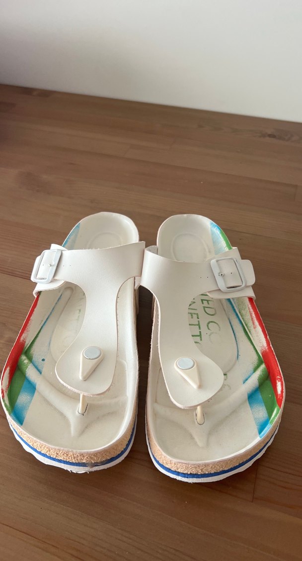 Beyaz tokalı, dolgu topuklu erkek terlikleri kauçuk malzemeden. Minimalist tarzda, renkli detaylar ve tabanda 'IETT' yazısı bulunur.