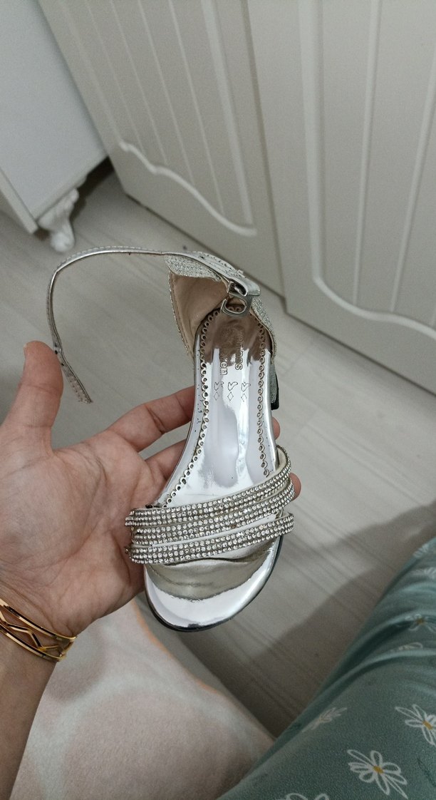 gümüş parlak simli kalın topuk bantlı kız çocuk topuklu ayakkabı