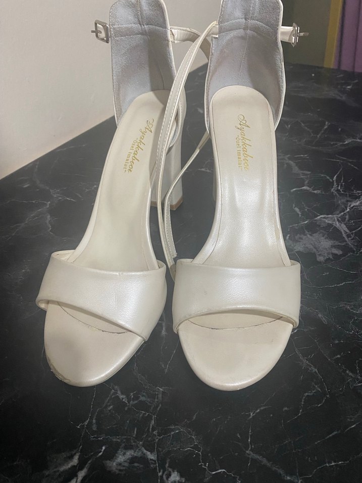 Beyaz tokalı ince topuklu kadın abiye ayakkabı, parlak yüzeyli ve minimalist tasarımlı. Klasik zarafete uygun, düğünler için ideal. Kauçuk malzemeden üretilmiştir.