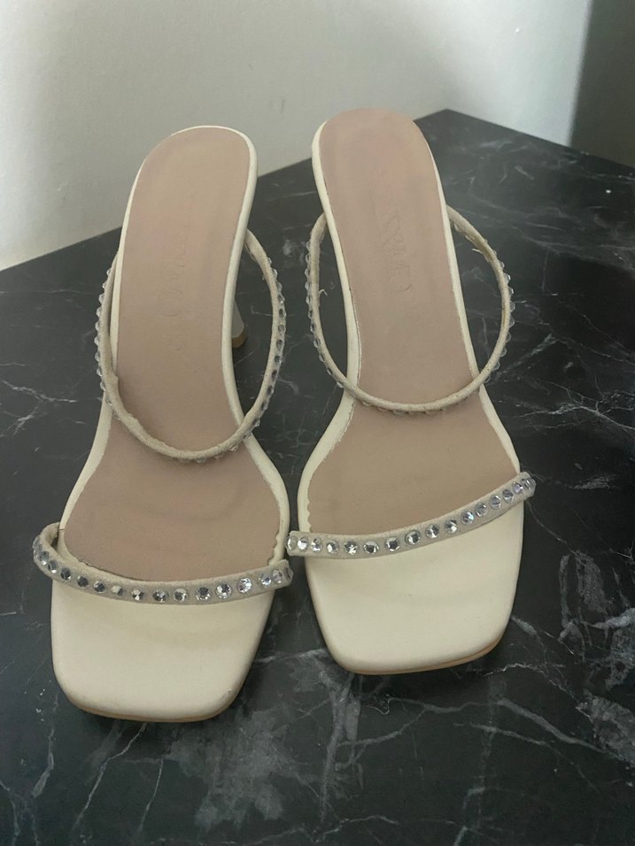 Beyaz, tokalı ve ince topuklu kadın abiye ayakkabılar, minimalist ve çağdaş tarzda, düğünler için uygundur. Parlak yüzeye ve desensiz tasarıma sahiptir.