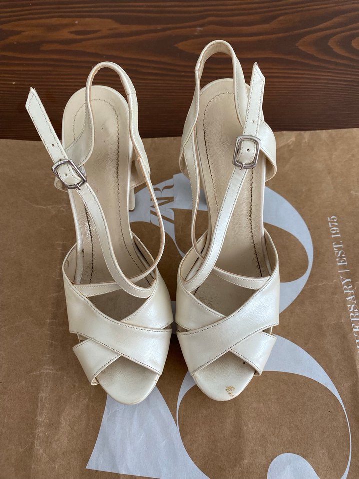 Yumuşak kauçuk malzemeden, tokalı bantlı beyaz ince topuklu ayakkabılar. Minimalist ve desen içermeyen tasarımıyla düğün ve klasik etkinlikler için uygundur. Düğün için ayağı hiç acıtmayan bir ayakkabı.
