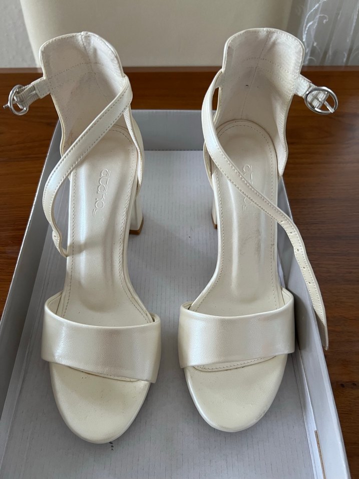 Ataköy marka deri, kullanımı çok rahattır. Beyaz, tokalı ve blok topuklu abiye ayakkabı. İpeksi bir dokusu vardır. Rengi ekruya daha yakındır tam beyaz değildir. Sorunu yoktur. Bir düğünümde bir de kınamda 2 kez giyildi.