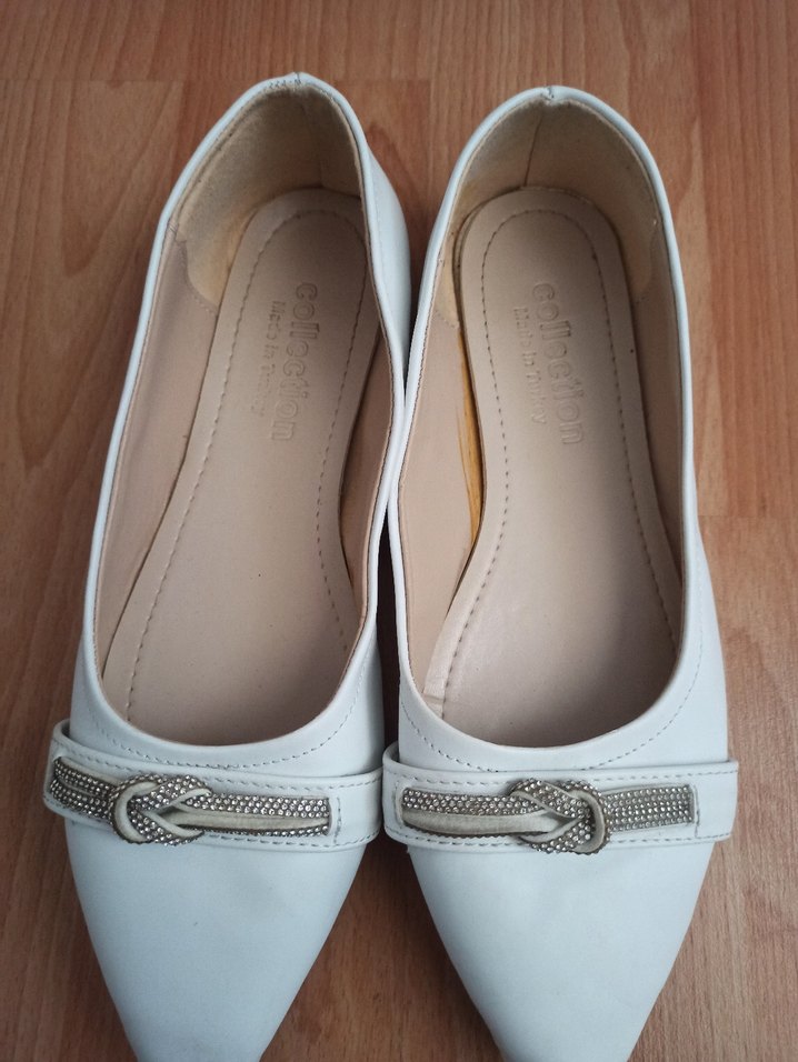Beyaz, tokalı ve blok topuklu kadın babetler. Minimalist ve klasik şıklık sunar, düğün gibi özel günler için uygundur.