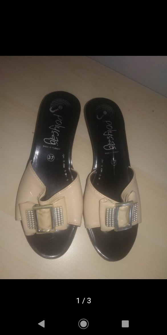 Beyaz, tokalı ve dolgu topuklu kadın terlikleri. Kauçuk malzemeden yapılmış, parlak yüzeye ve baskılı desene sahip, günlük kullanım için uygundur. Marka: Polycag.