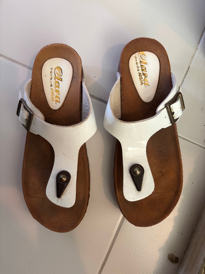 Beyaz tokalı, parlak dolgu topuklu kadın terlikleri dayanıklı kauçuktan yapılmıştır. Minimalist ve düz tasarımı günlük kullanım için uygundur.