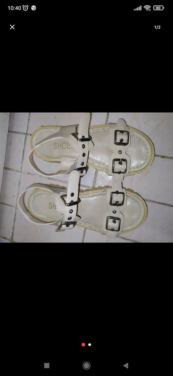 Beyaz, tokalı bantlara ve hafif yılan derisi desenine sahip, kauçuk malzemeden yapılmış dolgu topuklu kadın sandalet. Günlük sokak stili için uygun.