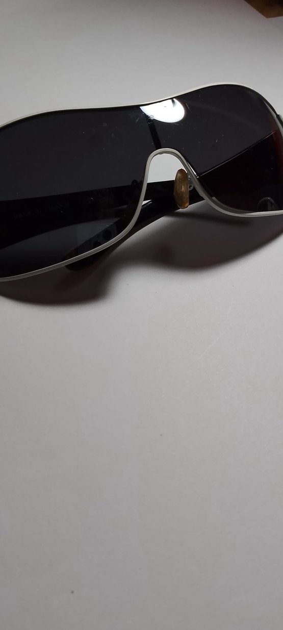 Minimalist ve çağdaş tarzda, beyaz çerçeveli, tokalı ve koyu renk camlı kadın güneş gözlüğü.