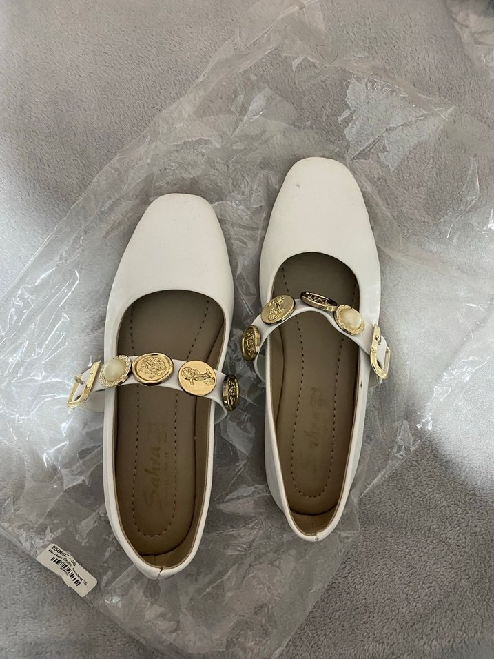 Beyaz, tokalı ve yılan desenli bantlı topuklu kadın babet. Kauçuk malzemeden, minimalist ve klasik tarzda günlük kullanım için uygundur.