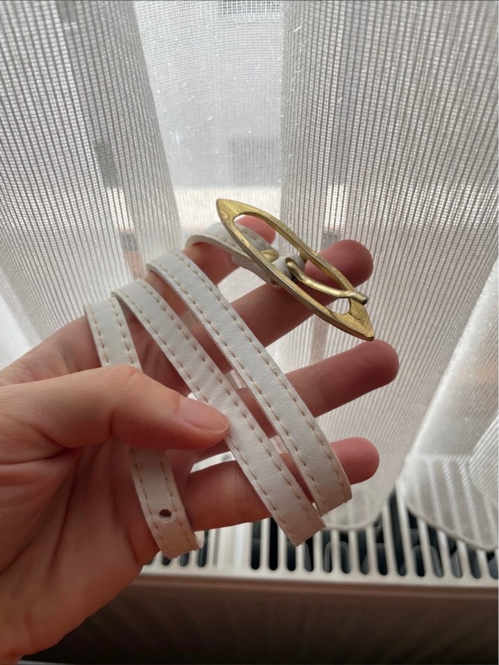 Beyaz kayış ve altın tonlu tokasıyla çağdaş ve Paris tarzı kadın kemeri.