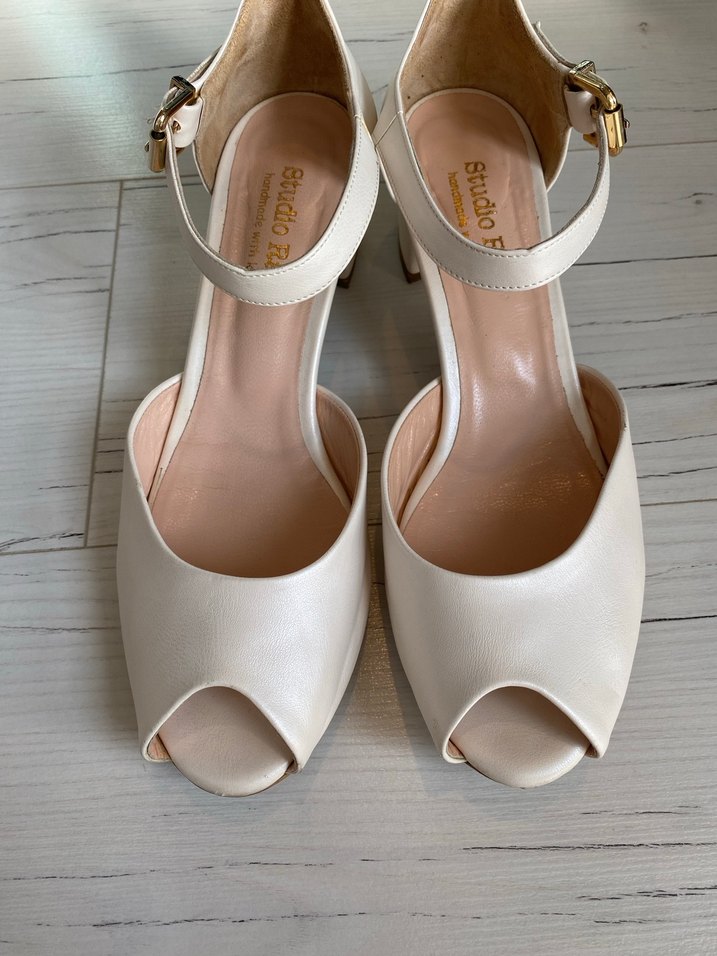 Beyaz, tokalı bantlı, kadın topuklu abiye ayakkabı. Klasik ve modern tarz, düğünümde giymiştim. Pastel ton, desensiz tasarım.