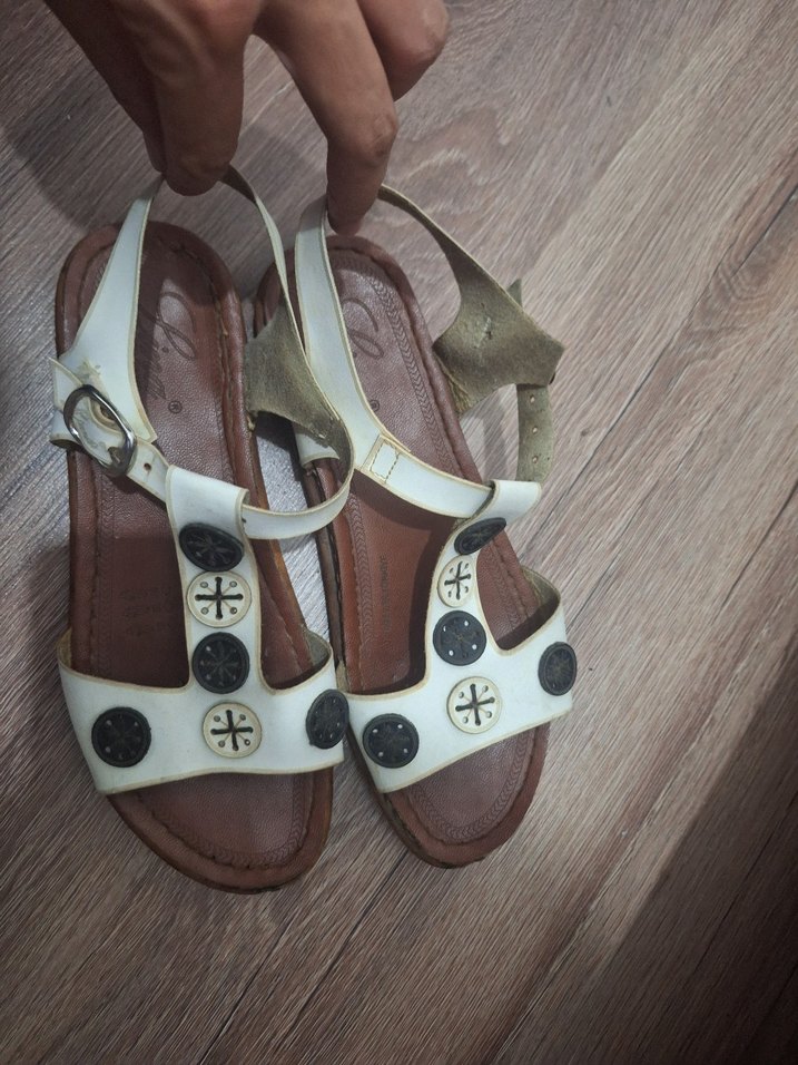 bir iki kez giyildi Beyaz tokalı kayışları ve işlemeli detaylarıyla sandalet, günlük kullanım için uygundur Minimalist ve bohem tarzlara uygundur.