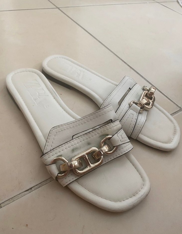 Beyaz, tokalı ve blok topuklu kadın terlikleri, kauçuk malzemeden yapılmıştır. Minimalist tarzda, günlük kullanıma uygundur. Tokalı tarafında yeşilimsi leke var incelemeniz rica olunur