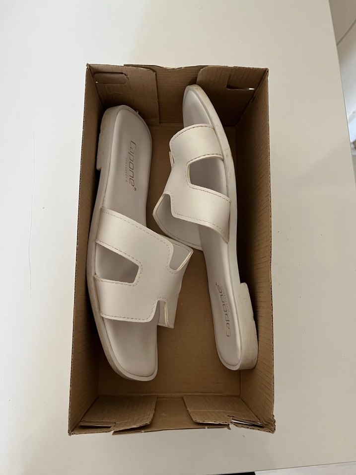 Minimalist tasarımlı beyaz kadın terlik, tokalı kayış ve stilettolu topuk ile çağdaş görünüm sunar. Günlük kullanım için kauçuk malzemeden üretilmiştir.