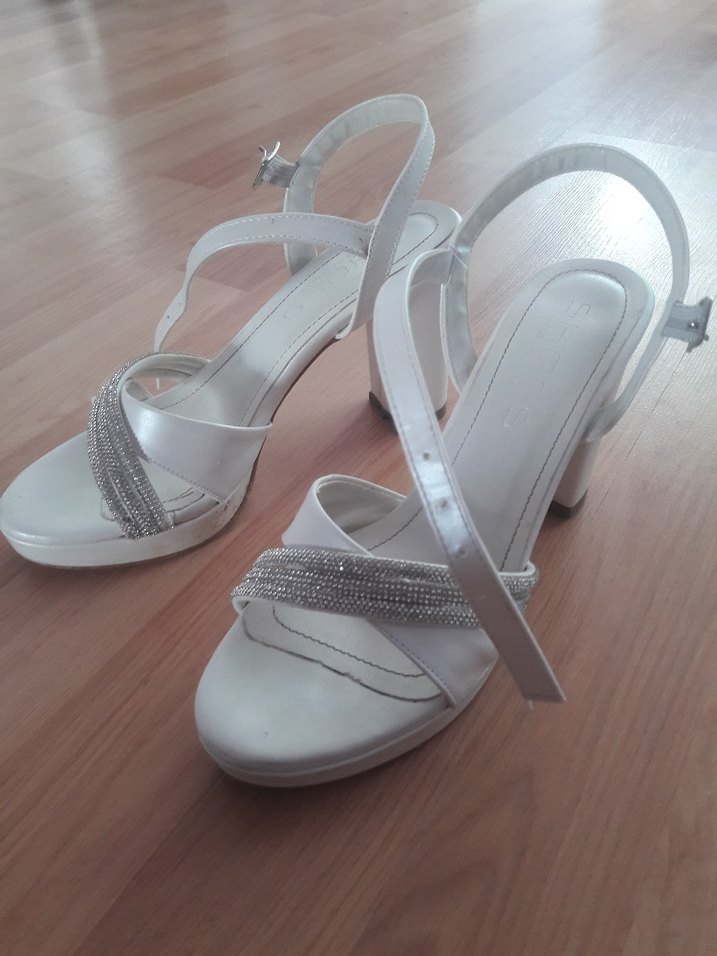 Parlak beyaz, tokalı kadın topuklu abiye ayakkabı. Minimalist ve çağdaş tasarıma sahip, düğünler için uygun. Sentetik kumaştan, desensiz model.