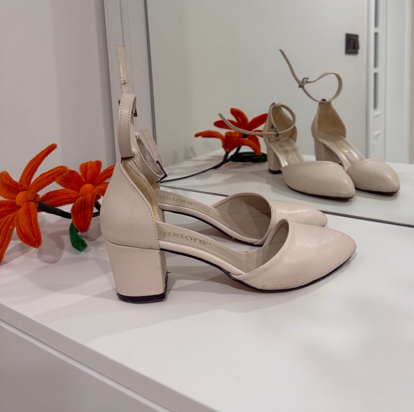 Beyaz blok topuklu, tokalı bilek kayışlı, modern klasik tarzda kadın ayakkabısı. Günlük şıklık için uygun.