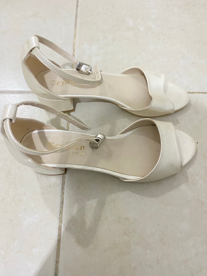 Beyaz tokalı, blok topuklu kadın ayakkabısıdır. Minimalist ve modern klasik tasarıma sahip, düğünler için uygundur. Kauçuk malzemeden üretilmiştir.