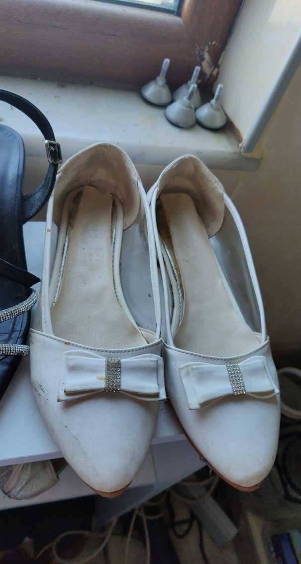 Beyaz renkli, tokalı ve taş detaylı fiyonk süslemeli, lastik malzemeden yapılmış klasik stilde kadın topuklu babet. Düğün gibi özel günler için uygundur.