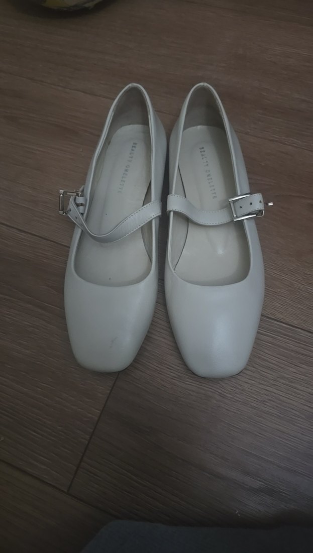 Beyaz, tokalı bantlı, blok topuklu kadın babet. Minimalist ve sade tasarımıyla günlük kullanıma uygundur. beauty omelette ürünü krem rengi resimde bir tık koyu