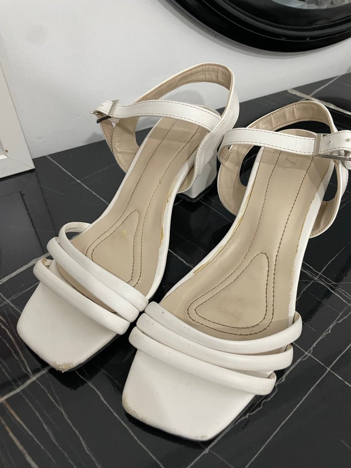 Beyaz tokalı, blok topuklu kadın sandalet. Minimalist ve desensiz tasarım, yumuşak kauçuk malzemeden, günlük kullanıma uygun. Ürün fazlalığıı