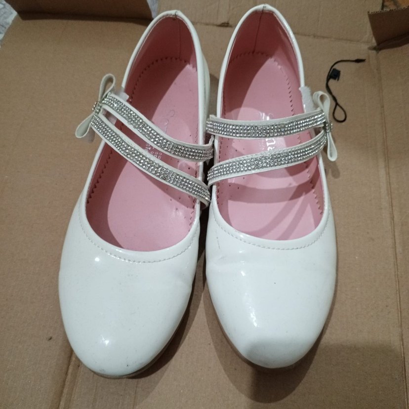 Beyaz tokalı çift bantlı kız çocuk babetleri, parlak taş detaylı ve pürüzsüz yüzeyli. İç kısmı yumuşak pembe renkte.