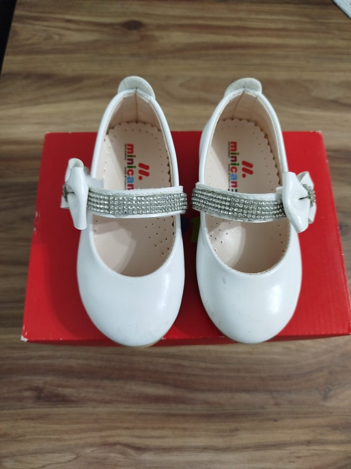 Beyaz renkli, tokalı bantlı kız çocuk babet ayakkabısı. Kauçuk malzemeden yapılmış, sade ve renkli klasik tasarım. Markası minic ninican.