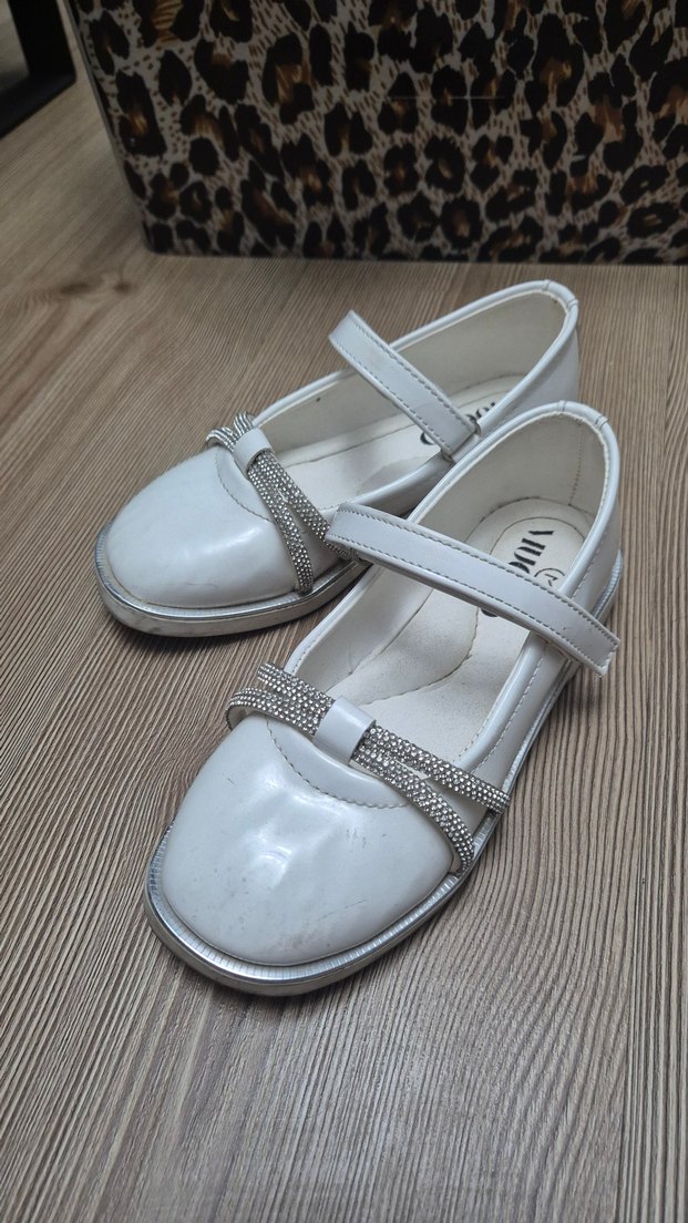 Beyaz lastik malzemeden, tokalı kayış ve süslü fiyonk detaylı kız çocuk babet ayakkabısı. Klasik ve sade tasarım, gri tonlarda.