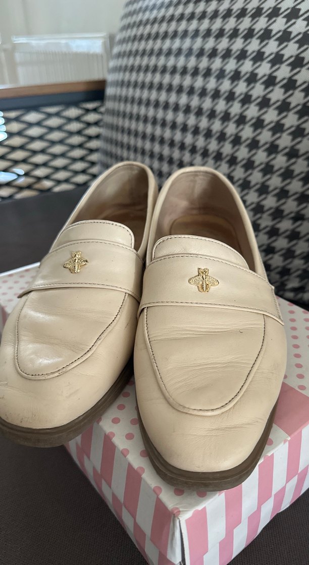 38 deri çok rahat pastel beyaz tokalı loafer ayakkabılar, yumuşak kauçuk malzemeden üretilmiş, klasik ve rahat sokak stilini yansıtır.