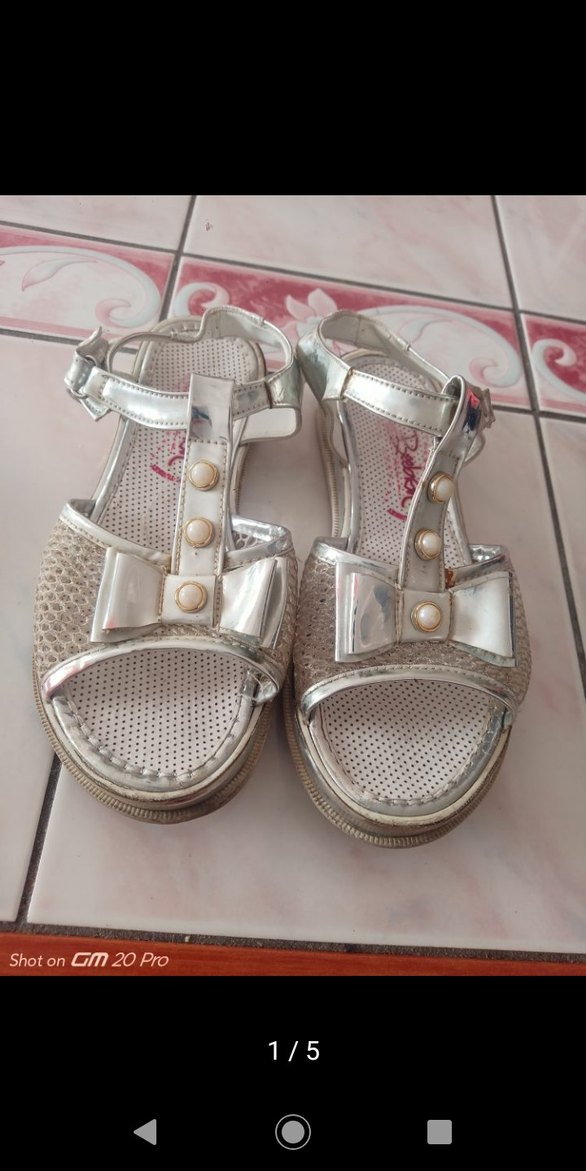 Beyaz parlak bantlara sahip, metal tokalı ve nakış detaylı kız sandaletleri. Ön kısımda dekoratif fiyonklar bulunur.