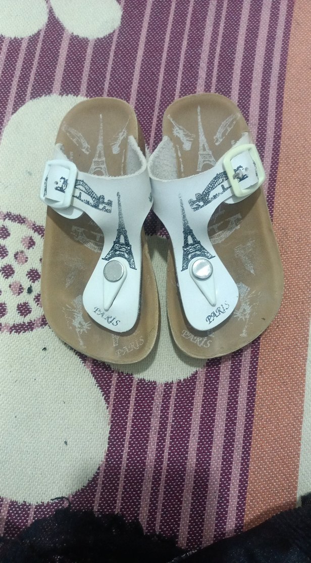 Beyaz kauçuk terlikler, Paris temalı baskılı, tokalı kayış ve ince topuklu tasarımla günlük sokak stiline uygun.