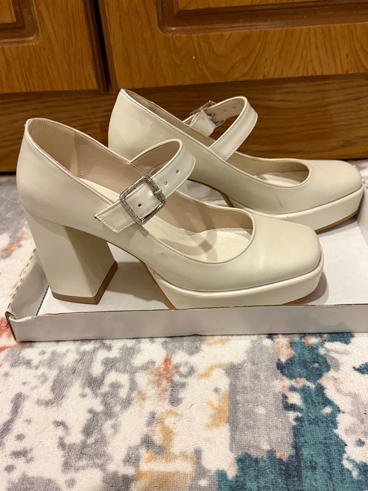 Beyaz tokalı platform topuklu ayakkabılar, modern klasik tasarıma ve kauçuk malzemeye sahip, düğünler için uygun. Defoları fotolarda mevcut kınalık altına giydiğim için hafif önden kırmızı oldu gelinlik altınada giydim. Giyilmeye engel değil ayakkabı tabanları ile gönderilecektir