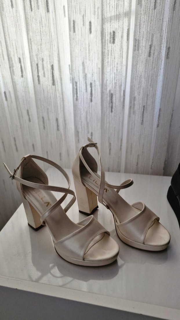 Beyaz tokalı platform topuklu abiye ayakkabılar, minimalist ve çağdaş tasarıma sahip. Düğünler için uygun, rahat kauçuk malzemeden üretilmiştir.