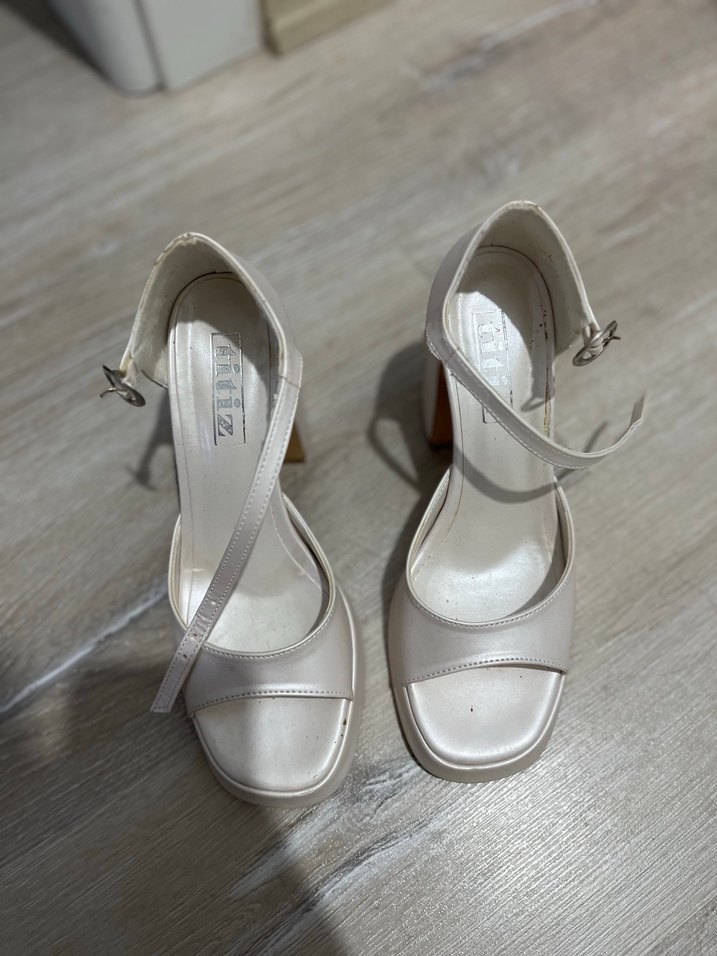 Beyaz renkte, tokalı kayışlı ve platform topuklu minimal tasarıma sahip kadın ayakkabısı. Düğün ve günlük kullanım için uygundur. Bir kere düğünde giyilmiştir.