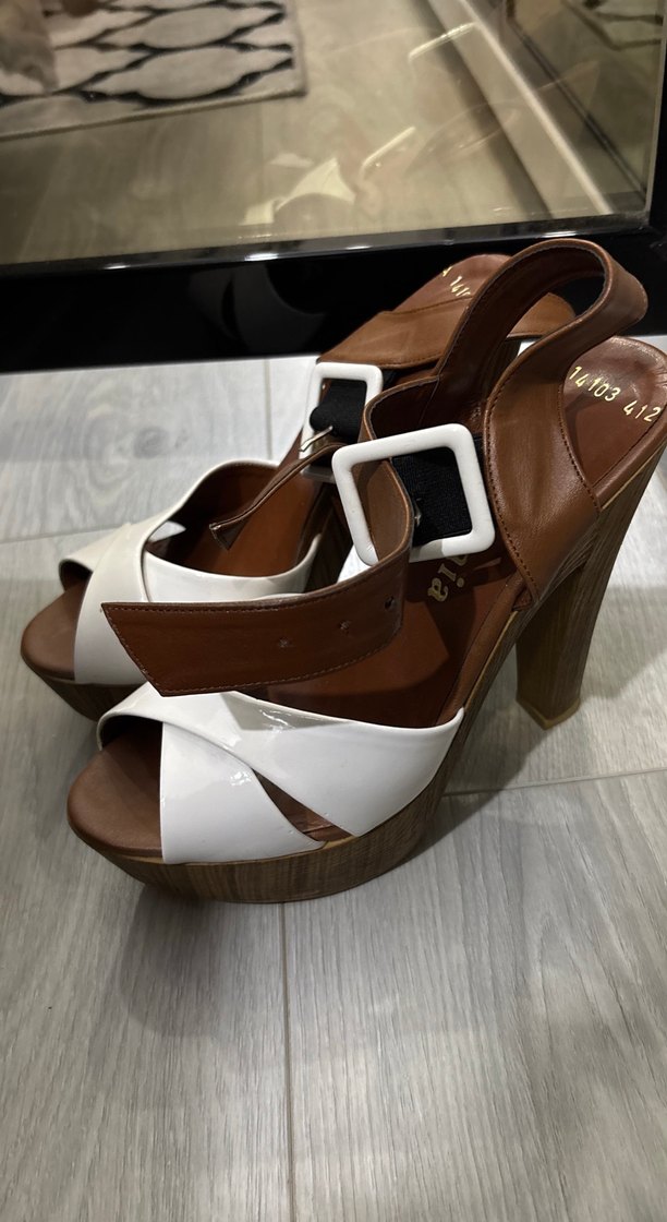 Koyu renk ahşap topuklu, beyaz tokalı platform kadın sandaletler. Günlük kullanım için şık ve çağdaş Paris tarzı.