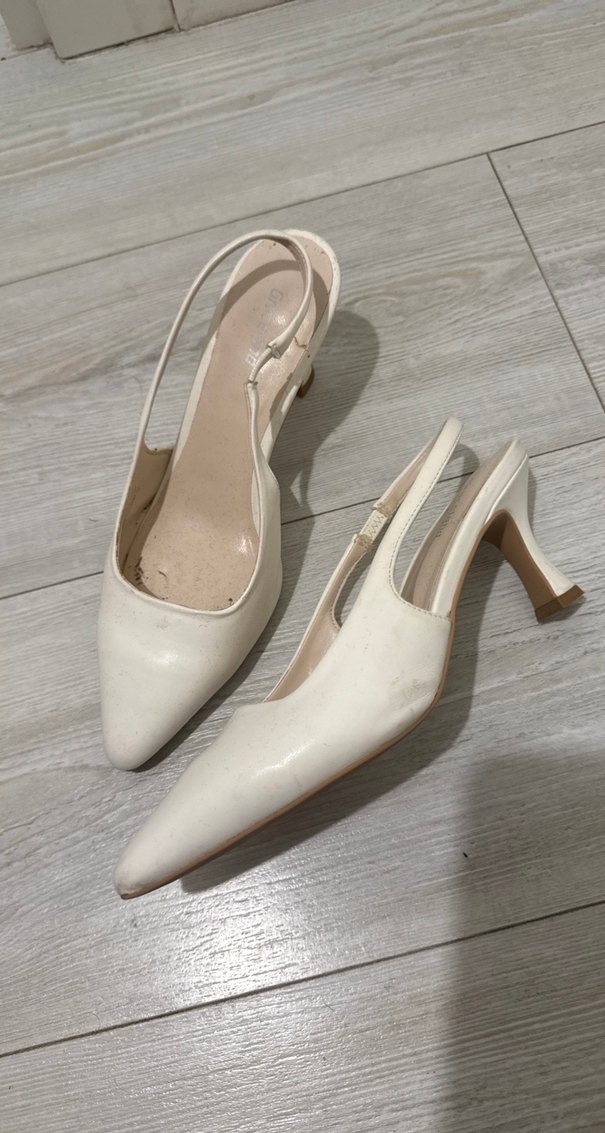 Beyaz, tokalı bantlı ve lastik malzemeden yapılmış stiletto topuklu ayakkabılar. Pastel tonlarda, modern klasik tarzda, düğün için uygun.