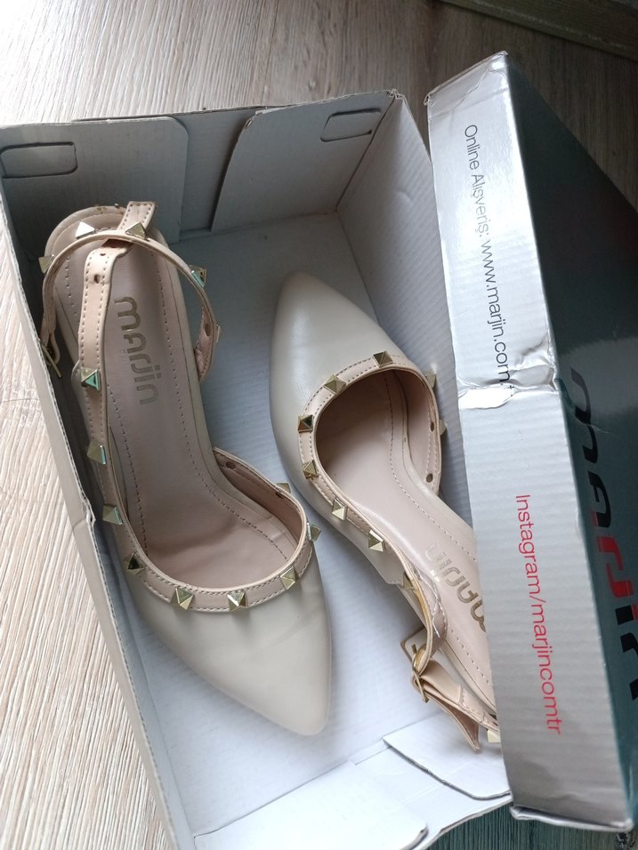 Beyaz tokalı stiletto topuklu ayakkabılar, yumuşak kauçuk malzemeden üretilmiştir. Günlük kullanıma uygun, çağdaş Paris tarzında, trend sahibi rahat bir modeldir.