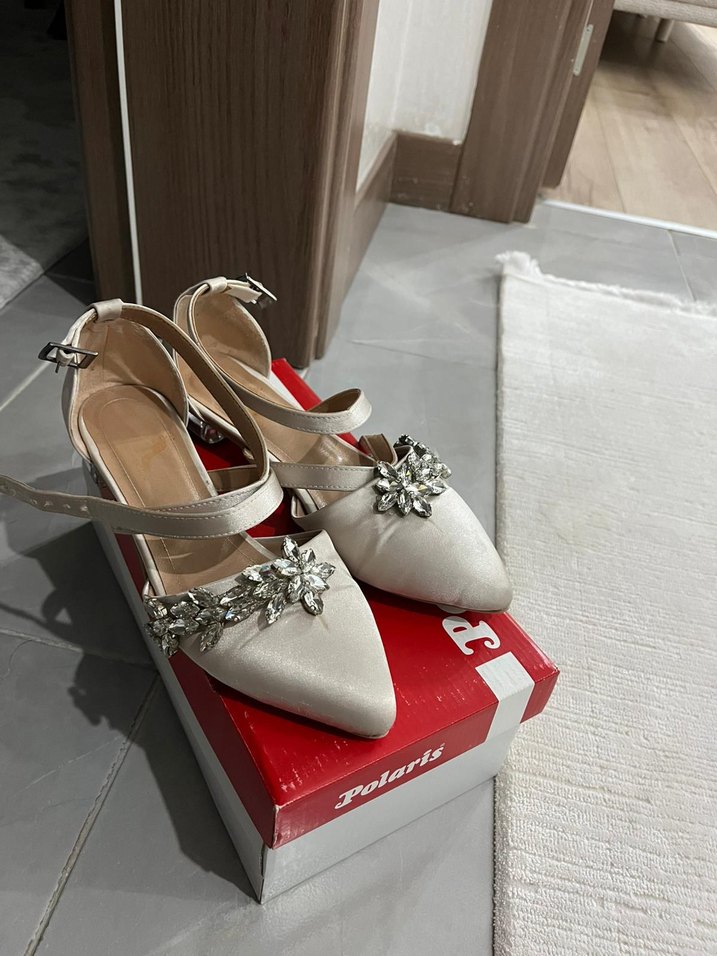 Beyaz renkte, tokalı ve taş detaylı kadın topuklu ayakkabıdır. Sentetik kumaştan yapılmış, klasik ve minimal stil sunar.