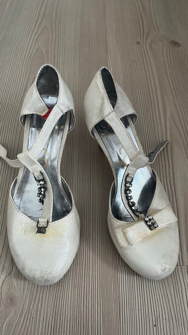 Beyaz, tokalı bantlı ve parlak yüzeyli, vintage tarzda kadın topuklu ayakkabı. Düğünler için uygundur ve kauçuk malzemeden yapılmıştır.