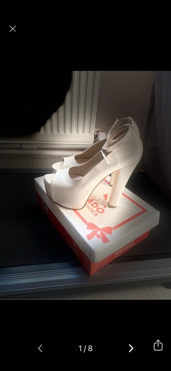 Beyaz, tokalı ve yüksek topuklu kadın abiye ayakkabısı. Kauçuk malzemeden üretilmiş, düğünler için uygun çağdaş tarzda. Hafif renk ve ince desenli detaylarla şıklık katıyor. Suni Deri Gelin ayakkabısı 15 cm platform topuklu bilekten bağlamalı. 38 numara. Bir kere kullanıldı sol ayak altında isimler yazıyor görsele de ekledim herhangi bir defosu yoktur. Kutusu ile gönderim sağlanacaktır