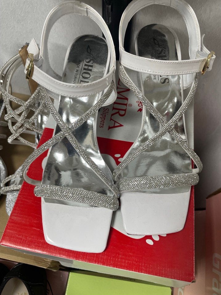 Beyaz renkli, tokalı ve desenli parlak bantlarla süslenmiş yüksek topuklu abiye ayakkabılar. Düğün ve özel günler için uygundur, rahat kauçuk malzemeden üretilmiştir.