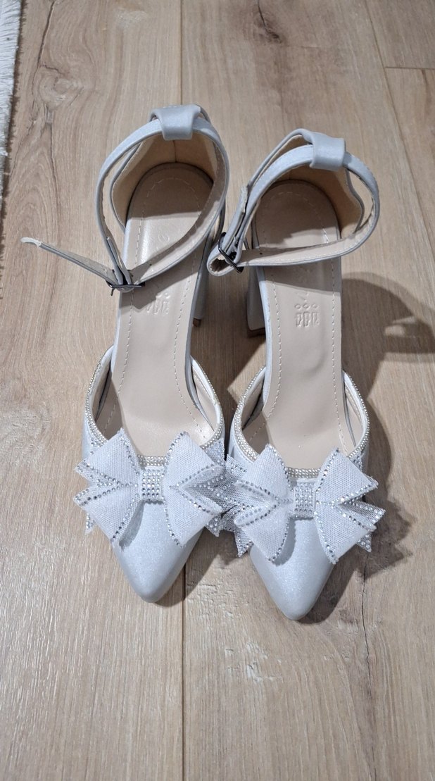 Topuklu, beyaz kadın abiye ayakkabı, bilekten bantlı ve fiyonk detaylıdır. Düğün ve minimalist stiller için uygundur. Rahatlık için kauçuk taban kullanılmıştır.