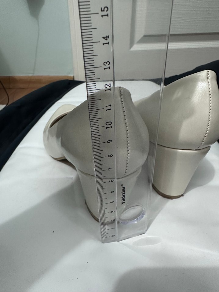 Yaklaşık 12 cm topuk yüksekliğine sahip beyaz kadın topuklu ayakkabılar, yanlarında gri bir cetvel ile gösterilmiştir.