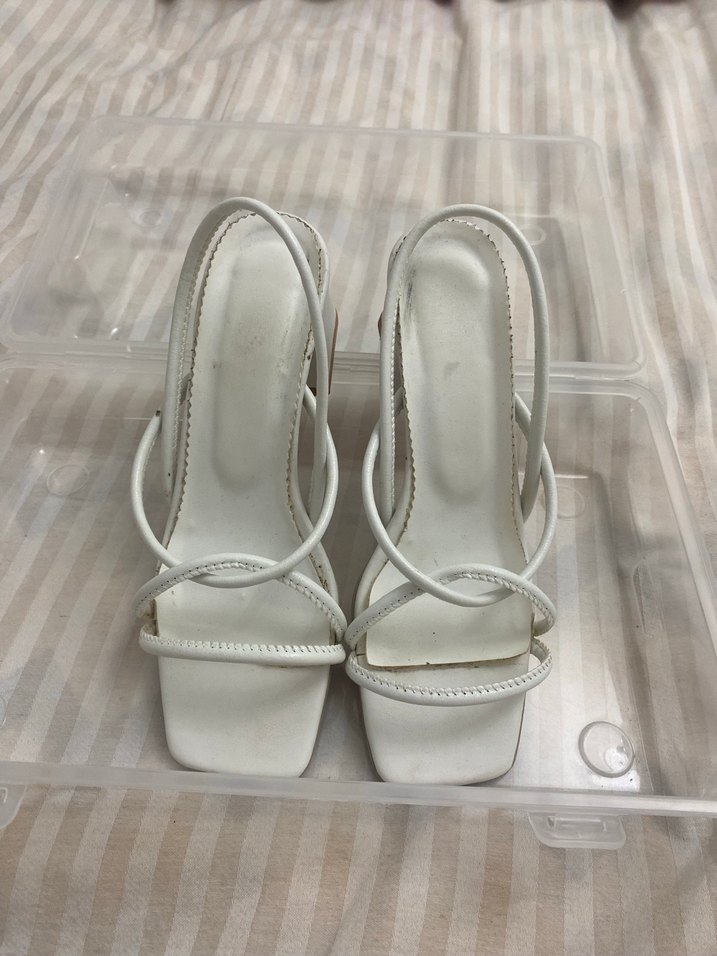 Beyaz topuklu kadın sandalet, minimalist tasarımlı, tokalı kayışlarla ve çağdaş stilde, yumuşak kauçuk malzemeden yapılmıştır. Klasik zarafet için uygun.