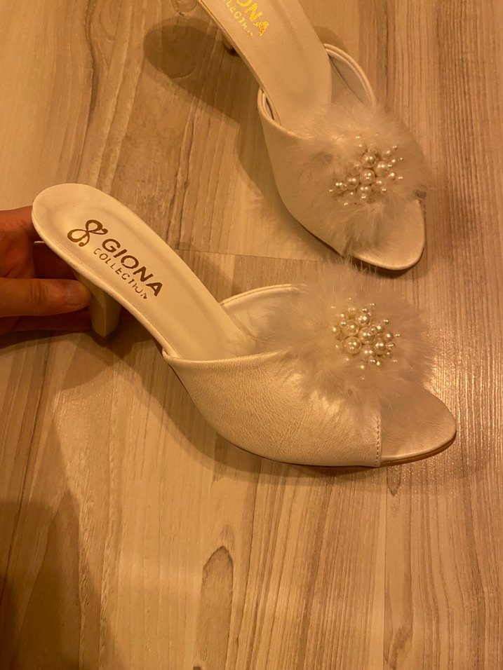 Beyaz Topuklu Tüylü Kadın Terlik - Görsel 1