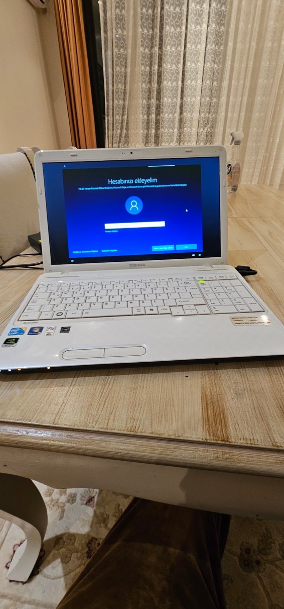 Tam klavyeli ve kurulum ekranı açık beyaz Toshiba dizüstü bilgisayar. Klavye altında dokunmatik yüzey bulunur.
