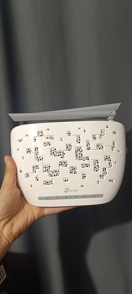 Dekoratif havalandırma delikleri ve tek ayarlanabilir antenli beyaz TP-Link kablosuz router. Kompakt ve hafif tasarım. Temiz az kullanılmış çalışır durumda. Kabloları mevcut.