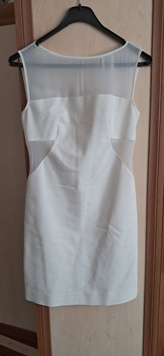Beyaz renkli, bisiklet yaka ve transparan detaylara sahip midi boy, vücuda oturan minimalist elbise.