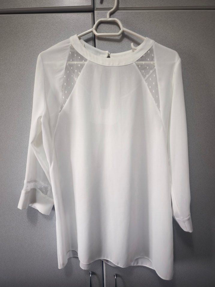 Beyaz, yuvarlak yakalı ve uzun kollu kadın bluz. Transparan detaylara ve bol kesime sahiptir, rahat sokak stili için uygundur. Kumaşı hafif ve yumuşaktır.