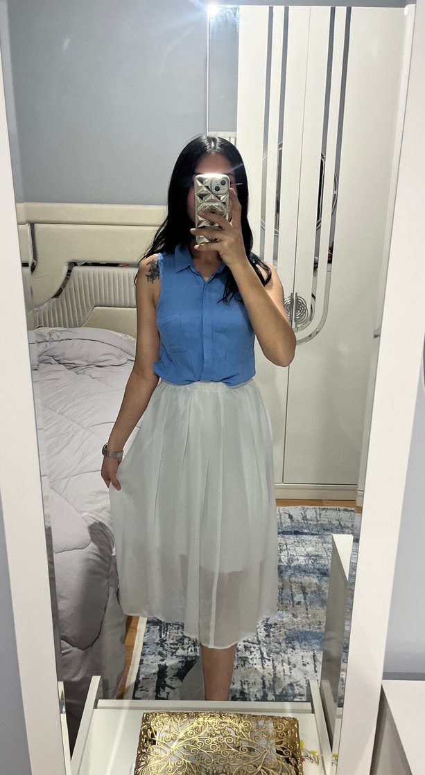 Pamuklu, beyaz renkte, şeffaf katmanlı, bol kesim midi kadın eteği. Ofis ve günlük sokak stiline uygun.