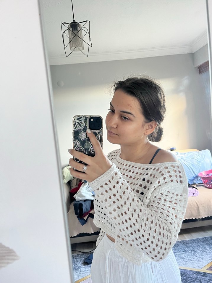 Uzun kollu, , beyaz transparan örgü kazak. Gevşek kesim ve midi boyuyla günlük kullanıma uygun bohem tarzda. İçine iç çamasırıyla efsane duruyo
